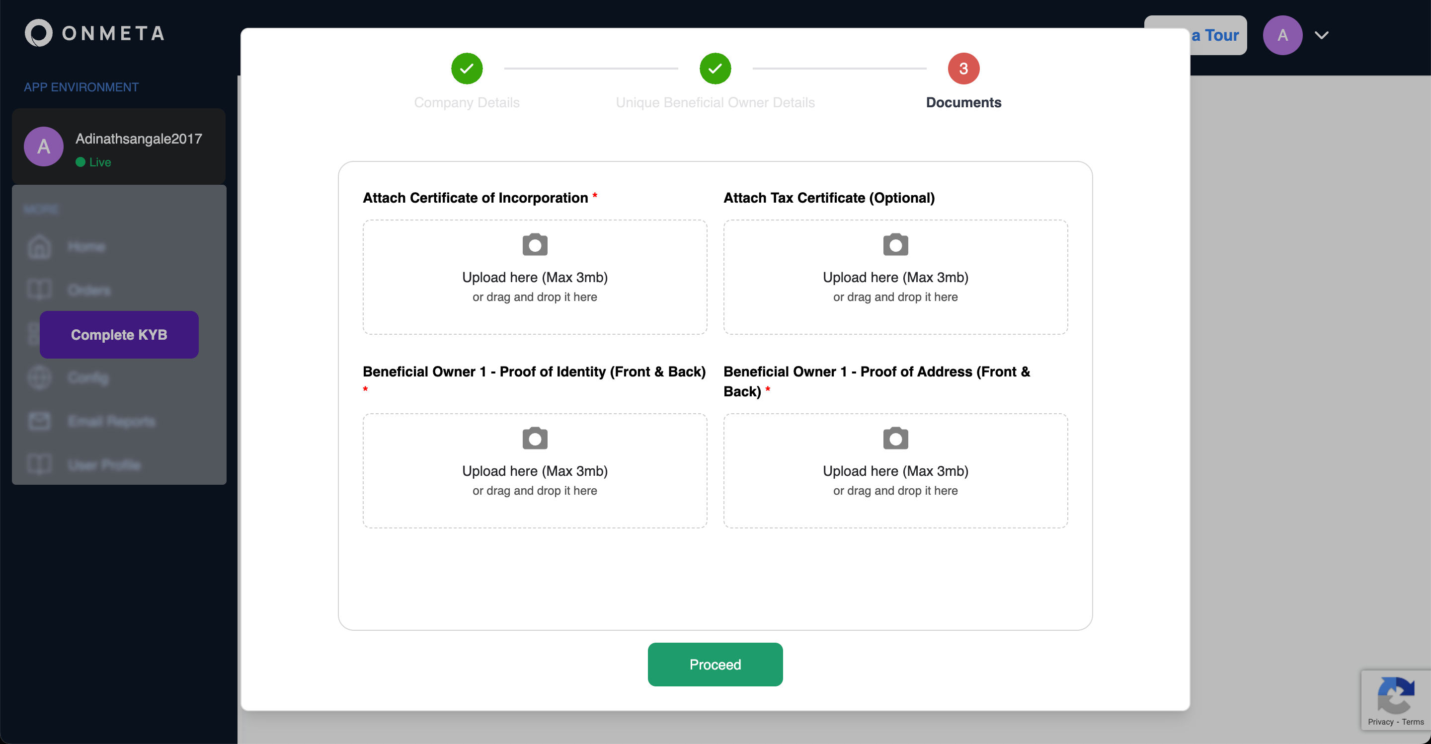 After submission, Onmeta's compliance team reviews your KYB application. Approval typically takes 2-3 business days. You'll receive email notifications regarding the status of your application.